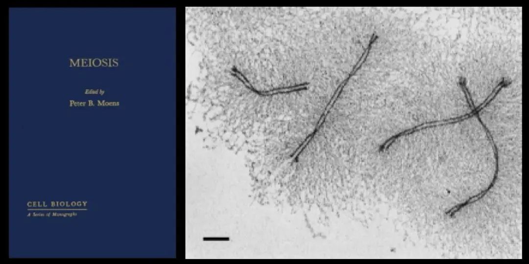 图1:减数分裂染色体的“轴-环”组织形式。图中显示的是哥伦比亚蛾(Hyalophora columbia)减数分裂细胞核经硝酸银染色后在电子显微镜下呈现的形态。4对已经完成联会的染色体中央两排深色的平行结构即为染色体轴。染色质环则散布在轴的四周。图片修改自Peter B. Moens编辑的《Meiosis》第一版(1987)。