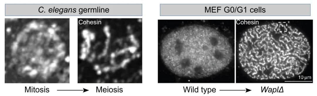 有趣的是,对减数分裂染色体轴组装分子机制的研究得以实现突破的灵感却来自于有丝分裂细胞中观察到的一个现象。2013年Jan-Michael Peters研究组在Nature上报道了在体外培养的小鼠胚胎成纤维细胞