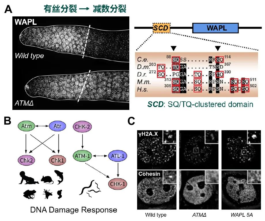 图3:ATM通过磷酸化WAPL来促进染色体轴的组装和DNA损伤修复。(A)线虫性腺免疫荧光染色揭示WAPL在减数分裂起始后被迅速下调;右侧的氨基酸序列比对显示出WAPL家族蛋白在N端具有一个之前未被发现的SCD结构域。(B)DNA损伤应答信号通路在不同物种中的层次结构。(C)黏连蛋白在HeLa细胞中的染色揭示出黏连蛋白在DNA损伤位点的富集依赖于ATM的活性与WAPL的SCD结构域。