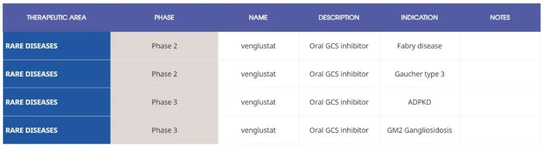 赛诺菲已完成并正在进行评估venglustat治疗Gaucher病3型、Fabry病和GM2神经节苷脂病的研究。这些疾病是遗传基因异常引起的LSD。GSLs的异常积聚是某些溶酶体贮积病 (Lysosomal storage diseases,LSD)的核心,促进清除这些积聚的脂质的疗法已在Fabry病和Gaucher病中通过临床研究得到证实。在这种情况下,venglustat作为一种底物还原疗法(SRT),并被证实用于某些LSD。