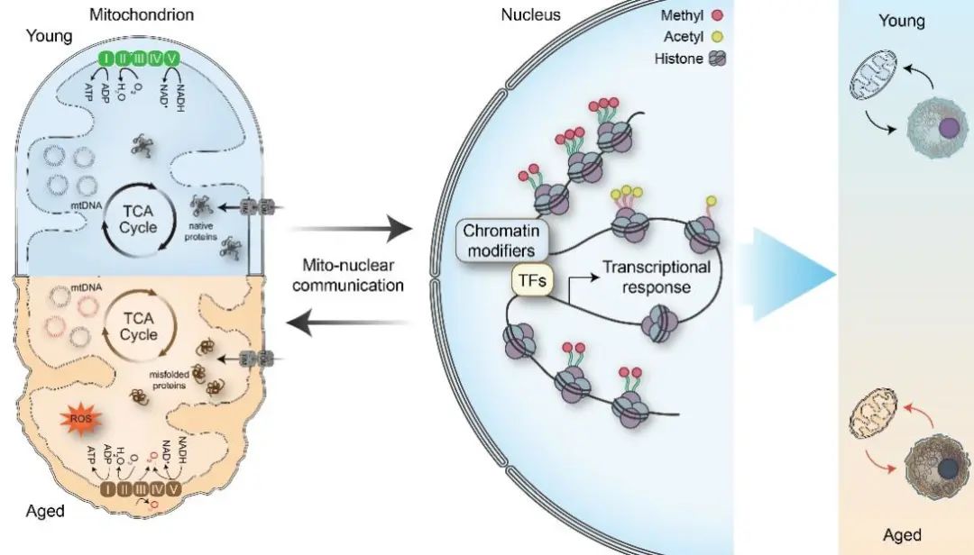 线粒体的蛋白质组由细胞核和线粒体DNA (mtDNA) 共同编码,维持线粒体与细胞核之间的交流对于线粒体的功能十分重要。衰老过程通常伴随着线粒体氧化磷酸化活性降低、TCA循环相关酶含量下降、mtDNA突变累积、活性氧增加,以及线粒体蛋白稳态的失衡。这些变化会影响线粒体与细胞核之间的交流,导致基因表达的变化并影响衰老进程 (图1)。