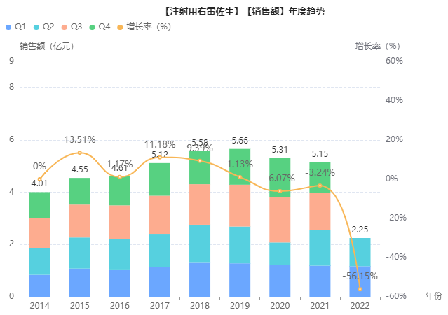 右雷佐生最早由美国Chiron公司开发,1992年首先在意大利上市,1995年7月获FDA批准上市,而后陆续在欧洲、亚洲、非洲等多国上市。目前,注射用右雷佐生已被纳入国家医保乙类目录。据药融云数据库,2021年右雷佐生院内销售额超过5亿元。