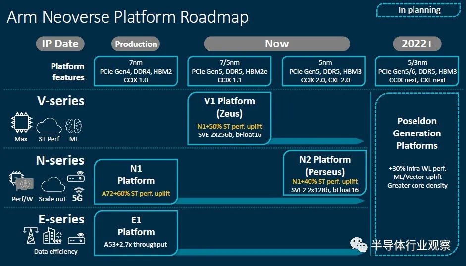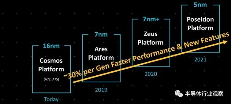 当Arm的Neoverse最早于2018年10月提出时,那时Arm的想法是希望能拥有专门针对服务器的专用IP。而在当时,只有16纳米的“ Cosmos” N0(实际上是Cortex-A72和Cortex-A75)设计,7纳米的“Ares”原计划于2019年面世,使用增强型7纳米工艺的“Zeus” 则在2020年面世,5纳米的“Poseidon”在2021年。