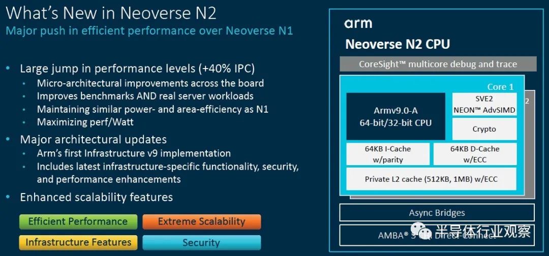 V1设计针对具有32到128个内核且散热范围在80瓦到350瓦之间的CPU,而N2内核则针对可能具有12到36个内核,运行功率在30瓦到80瓦之间的主流基础架构服务器。但这并不是说不会有N2芯片无法突破核心限制,我们认为Ampere Computing,AWS以及Nvidia可能会在某些设备中使用N2内核。(Ampere和AWS不太可能在各自的Altra或Graviton芯片中使用V1内核。)