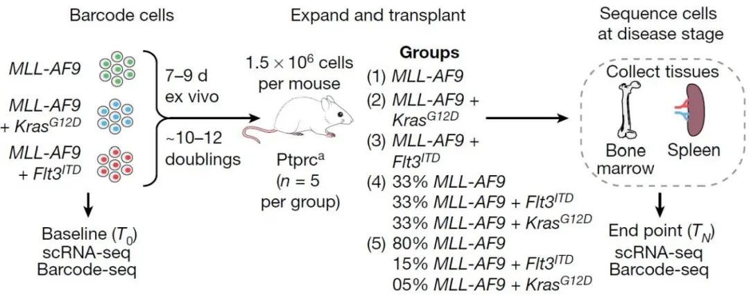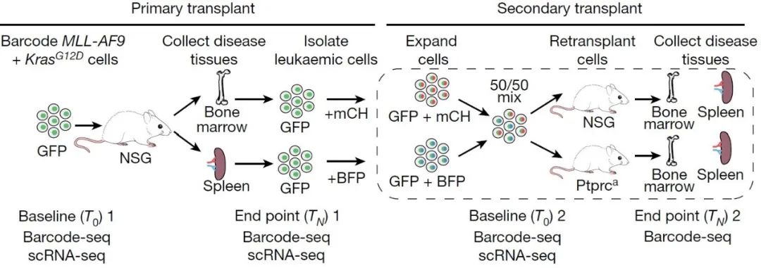 本研究中的所有体内实验均确定了癌症起始克隆中富集的预先存在的细胞固有转录状态,为了检验这些转录状态是否可遗传,研究人员从患病小鼠的骨髓和脾脏中分离出SPLINTR GFP标记的MLL-AF9 KrasG12D细胞,并用不同的SPLINTR文库对这些细胞重新编码,然后按同等比例混合再次移植到NSG或Ptprca小鼠体内(图2)。实验结果发现,癌症起始细胞固有的转录/表观遗传特征在癌症起源细胞的原生微环境中保存得最好,同时证实了克隆适应性特征的非遗传性遗传——尽管在体外和体内暴露于不同的微环境中,一些细胞仍能稳定地遗传癌症起始和生长所必需的转录状态。