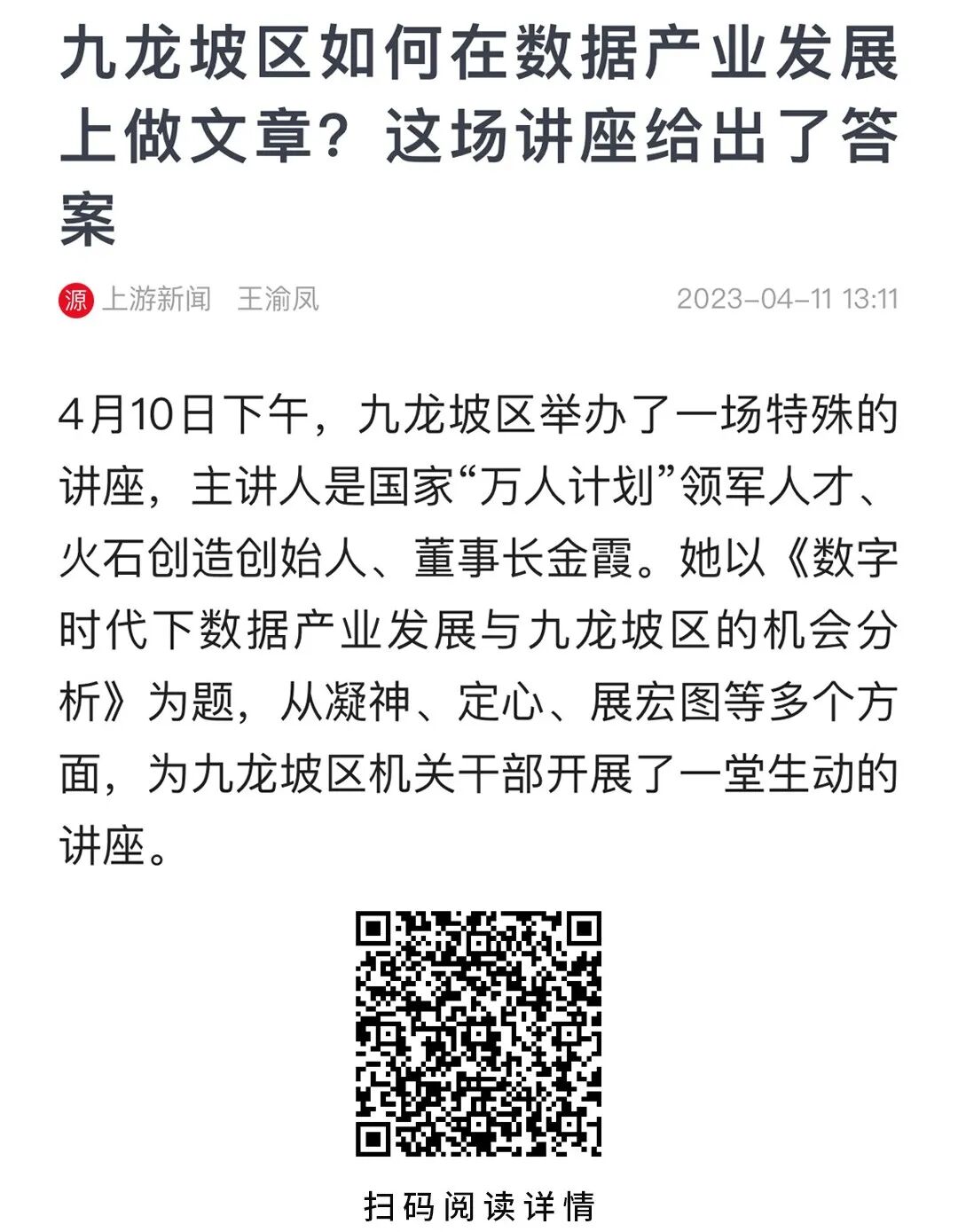 4月10日,重庆市九龙坡区委书记李春奎主持召开区委理论学习中心组(扩大)专题报告会。国家“万人计划”领军人才、火石创造创始人、董事长金霞受邀作“数字时代下的产业发展与九龙坡的机会分析”专题报告。