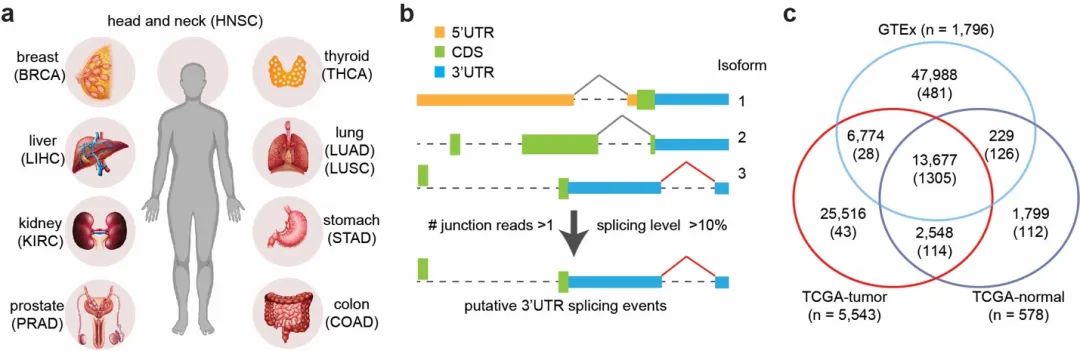 基于对来自10种不同癌症类型,超过8000个转录组测序样本的数据分析,文章揭示了一种以往被忽视的基因调控模式——位于3’端非编码区域的剪接,在癌细胞中普遍存在,并显著上调来驱动肿瘤发生。