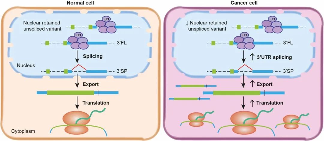 示了一种以往被忽略的基因调控模式——位于mRNA的3’端非编码区域的剪接,广泛存在于癌症细胞中,并显著上调。