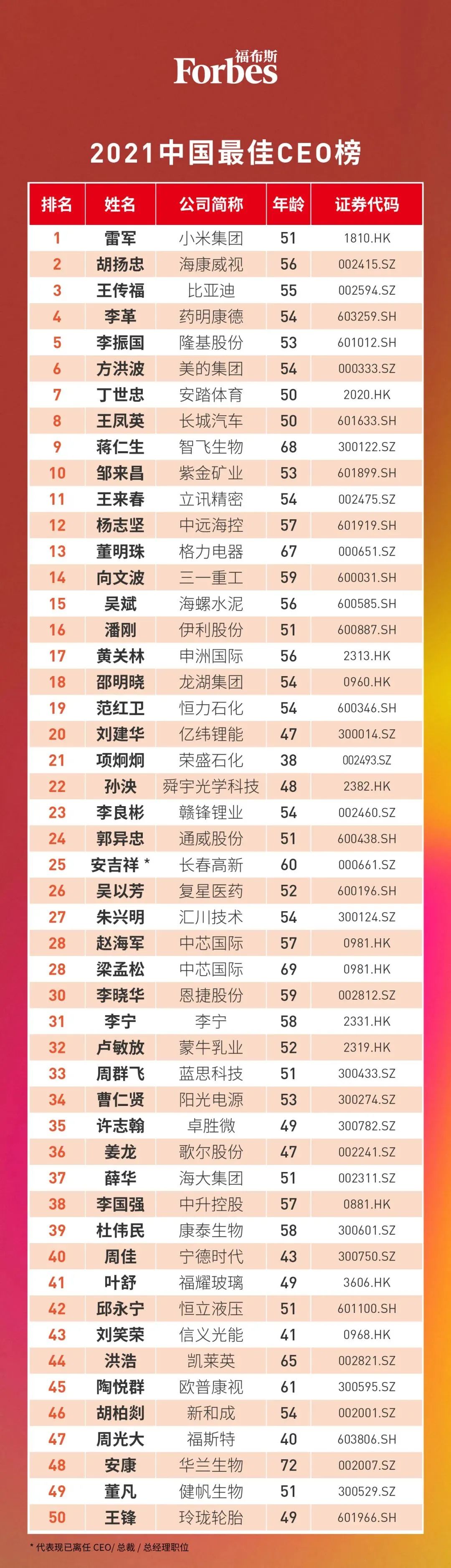 近日,福布斯中国最佳CEO榜单发布,共计50位CEO上榜。标的考察范围涵盖了A股、港交所上市的中资港股以及在境外上市的中概股。考察标准为CEO所在公司连续三年的经营业绩,而非短期内公司在资本市场中的表现。