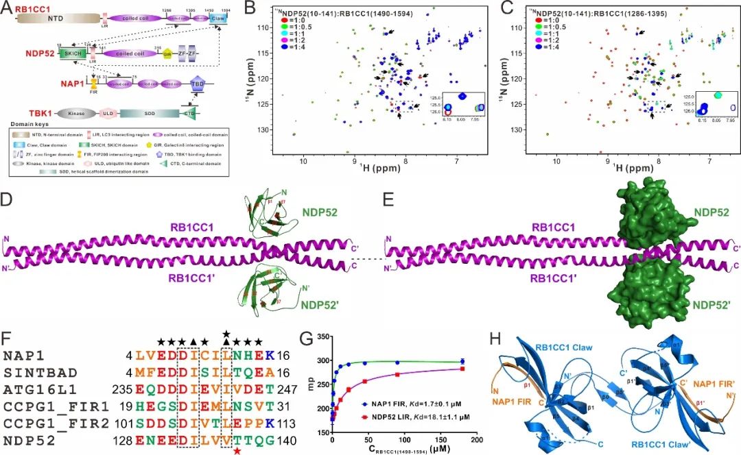 图1:NDP52和NAP1结合RB1CC1的生化和结构数据