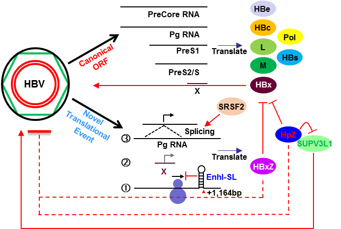 2021年4月5日,中国科学院分子细胞科学卓越创新中心(生物化学与细胞生物学研究所)-杭州高等研究院蛋白质稳态与疾病课题组团队在Journal of Hepatology在线发表了的最新研究成果 Translatomic profiling reveals novel self-restricting virus-host interactions during HBV infection 。该研究发现乙型肝炎病毒(Hepatitis B virus, HBV)的P基因和X基因分别各自编码了一个同源异构体HpZ/P’和HBxZ,它们可以抑制HBV复制;此外该研究还发现了一个定位在HBV增强子I区域的翻译调控元件。