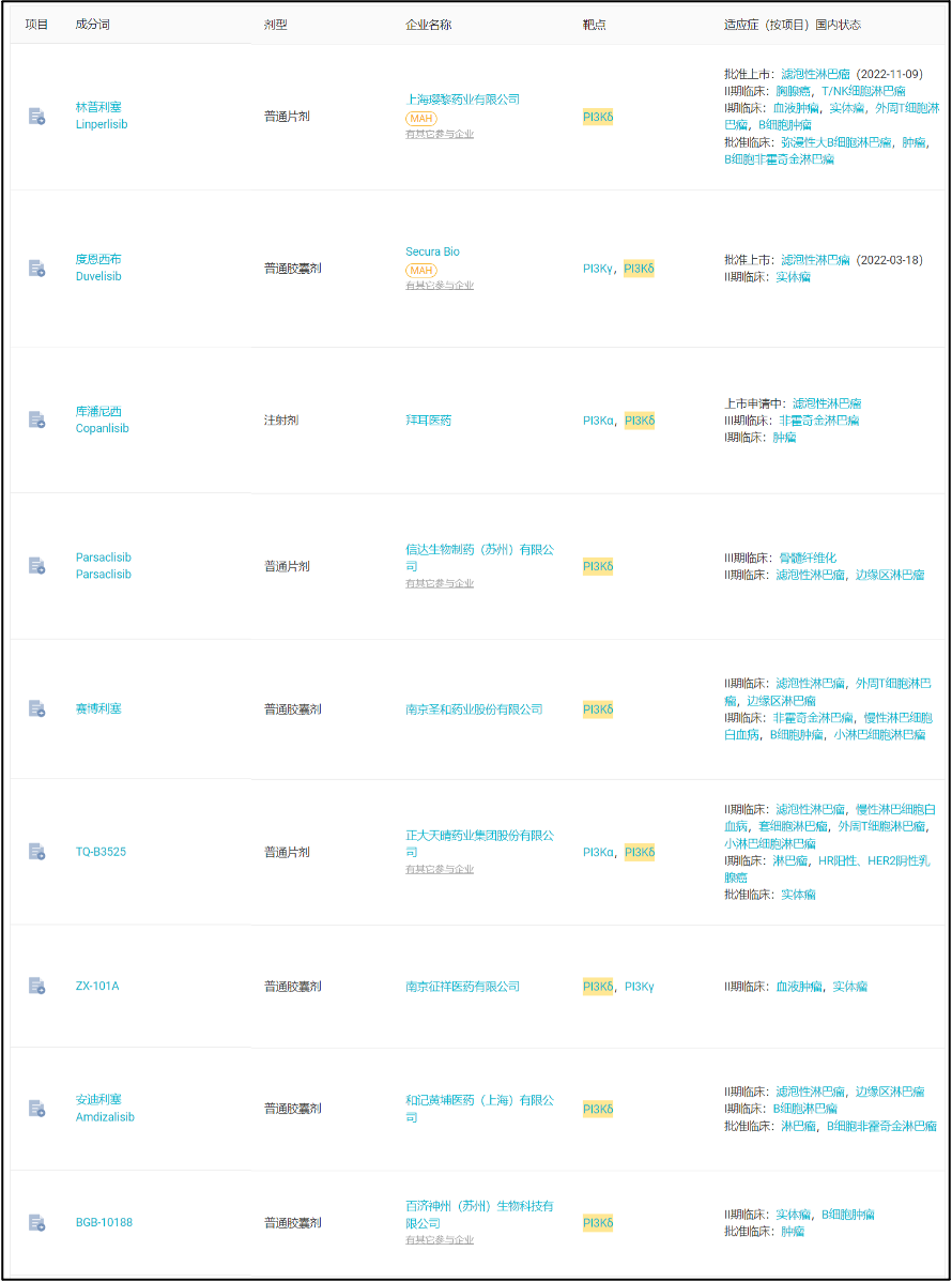 国内临床 II 期及以上 PI3Kδ 抑制剂