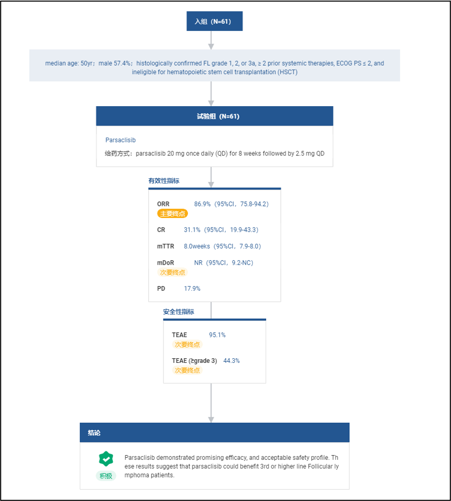 信达生物在 2022 ASCO 会议上发布了 Parsaclisib 在中国人群中的数据:在滤泡性淋巴瘤患者(N = 61)中 ORR 达到 86.9%(95%CI,75.8-94.2),其中 31.1%(95%CI,19.9-43.3)达到 CR: