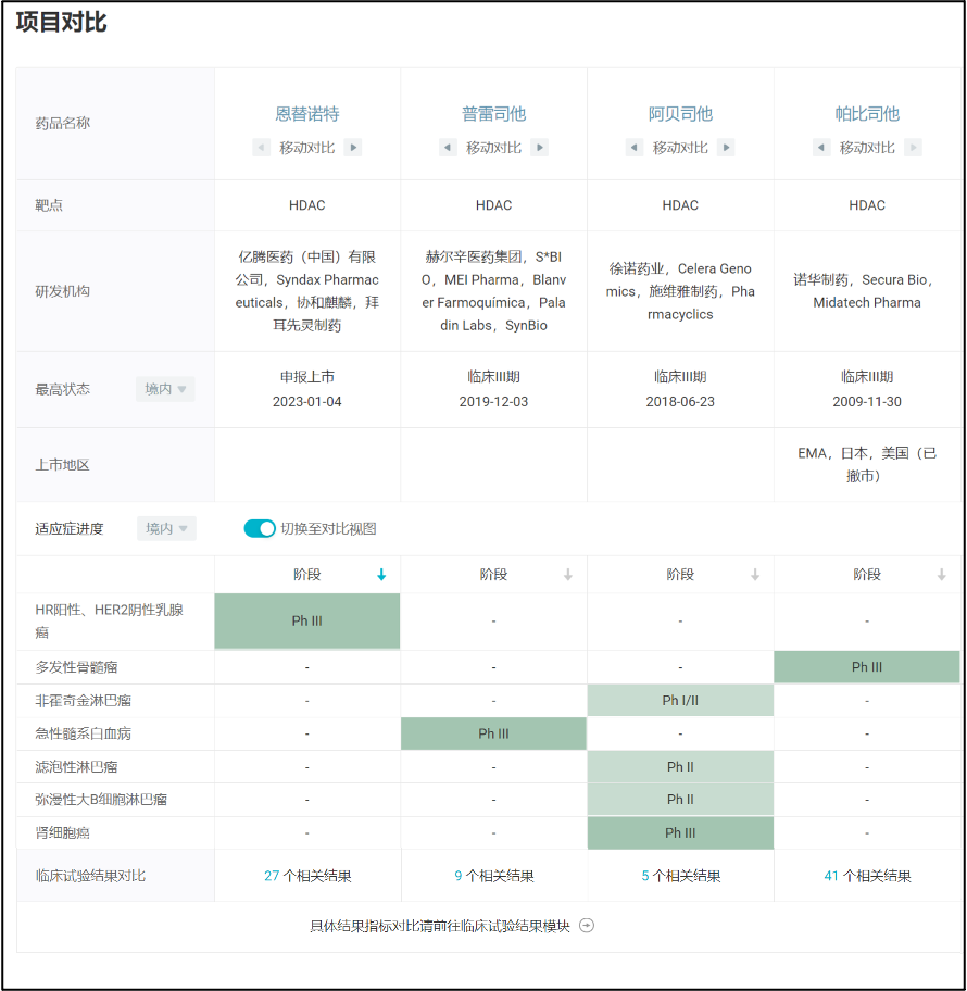 4 款国内 III 期临床 HDAC 抑制剂适应症对比
