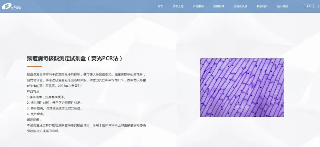 有消息称,之江生物拥有猴痘病毒核酸测定试剂盒(荧光PCR法),医谷通过之江生物的官网查询,查到了该产品,产品介绍称,该试剂盒通过特异性检测猴痘病毒的核酸片段,可用于临床或科研上对由猴痘病毒感染引起的相关疾病的诊断。