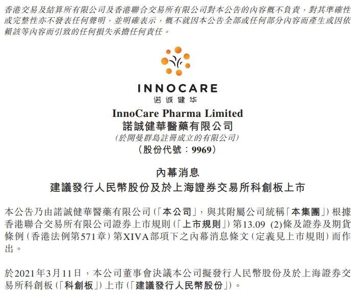 日前,诺诚健华发布公告称,公司董事会决议拟发行人民币股份及于上海证券交易所科创板(科创板)上市(建议发行人民币股份),截止今日收盘,诺诚健华报18.4元每股,总市值达275.94亿元。