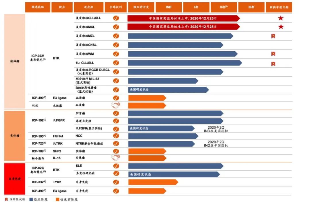 现阶段,诺诚健华建立了丰富的产品管线,适应症涉及淋巴瘤、肝癌、胆管癌、尿路上皮癌等多种恶性肿瘤及自身免疫类疾病,产品大部分处于I期、II期临床阶段及临床前阶段。