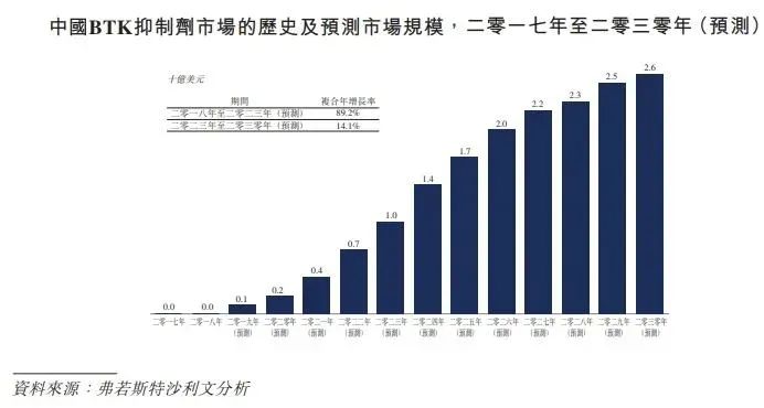 BTK抑制剂具有广阔市场空间,根据弗若斯特沙利文分析,BTK抑制剂的全球销售额在2018年达到45亿美元,依据23.3%的复合增长率,这一市场在2023年将预计达到129亿美元,在2030年则达到235亿美元。对应的中国市场,BTK抑制剂的市场规模预测将达到26亿美元,2018年-2023年的年复合增长率高达89.2%。