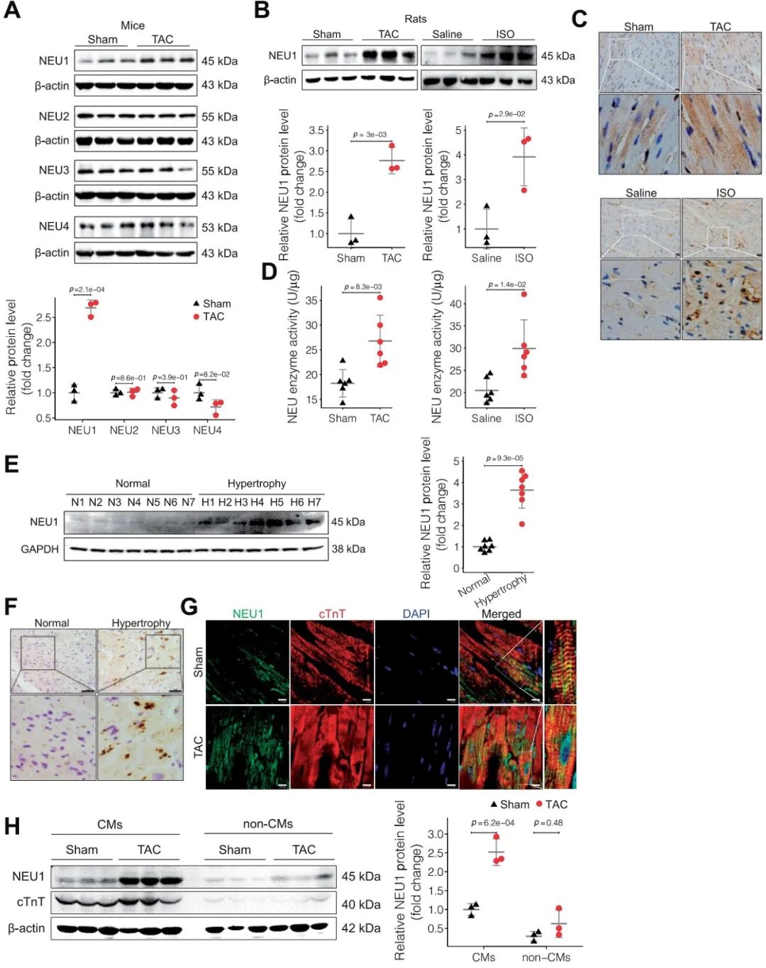 在这项研究中,科学家们首先通过几种小鼠和大鼠模型证实NEU1在肥厚的心脏中高表达,而神经氨酸酶家族中的其他亚型蛋白NEU2、NEU3和NEU4均未见明显变化(图2A–D),并且在肥厚型心肌病患者的心脏组织样本中进一步证实了NEU1水平的升高(图2E,F)。此外,他们还发现NEU1在心肌细胞中的表达水平显著高于非心肌细胞(图2G,H),这提示NEU1可能在心肌细胞中具有重要作用。