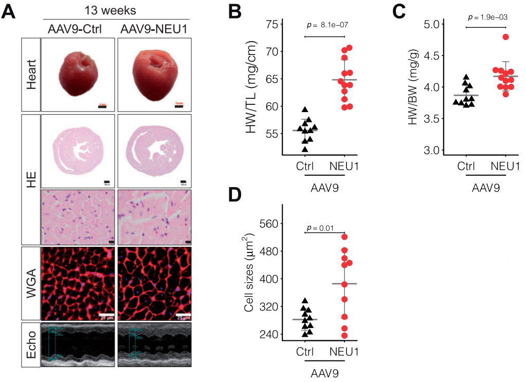 除了NEU1功能丧失外,科学家们还验证了NEU1功能获得造成的影响。正如预期的那样,NEU1过度表达加重了主动脉弓缩窄刺激的心肌肥大和重构的发展。令人惊讶的是,在没有任何病理刺激的生理条件下,NEU1过度表达13周导致小鼠心脏大小、心脏重量和心肌细胞横截面积显著增加(图4A–D)。