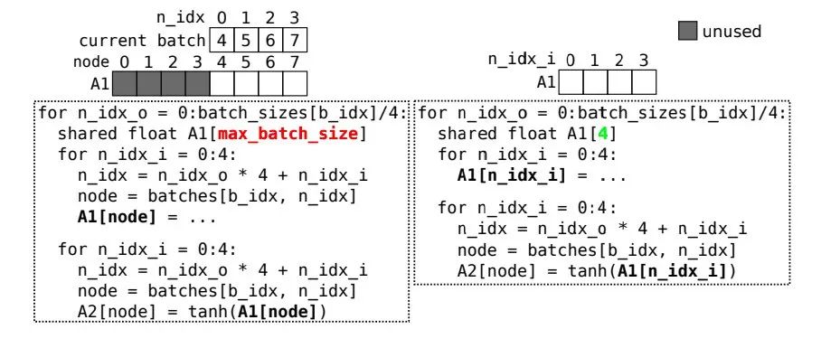 当中间张量存储在暂存器中时,用非仿射表达式索引它会导致张量稀疏。这种稀疏填充的张量会占用过多的内存, 其中A1的一半未使用。