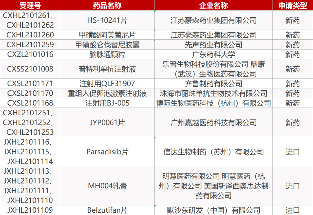 1.乐普生物PD-1抗体报产。乐普生物PD-1抗体普特利单抗注射液(HX008)的新药上市申请获CDE受理。乐普生物此前曾宣布,该公司计划于2021年分别就HX008治疗黑色素瘤和卫星不稳定(MSI-H)/错配修复功能缺陷(dMMR)实体瘤向NMPA提交新药上市申请。目前,HX008还有多项临床试验正在进行当中,包括胃癌或胃食管结合部癌二线治疗的Ⅲ期临床、非小细胞肺癌的Ⅱ/Ⅲ期临床,以及分别针对三阴性乳腺癌、非肌层浸润性膀胱癌等适应症的Ⅱ期临床等。