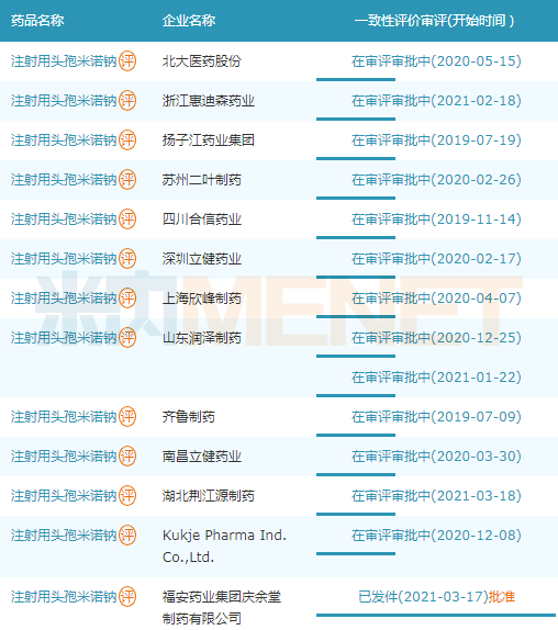 截至目前,注射用头孢米诺钠已有13家企业提交一致性评价补充申请。齐鲁制药、扬子江药业、四川合信药业、立健药业……12家企业该申请在审中,福安药业率先通过审批,成为该产品首家过评企业。
