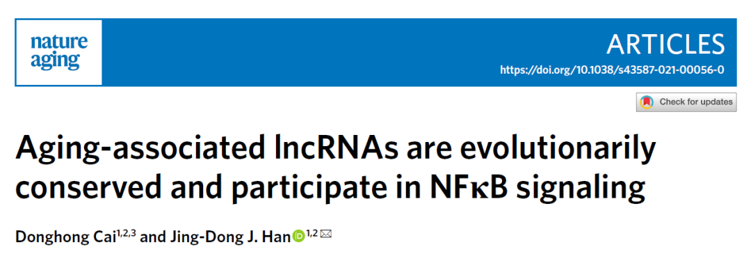 2021年5月6日,中国科学院上海营养与健康研究院韩敬东(现为北京大学定量生物学中心PI)研究组在Nature Aging期刊上在线发表了的研究成果Aging-associated lncRNAs are evolutionarily conserved and participate in NFκB signaling。该研究首先通过生物信息学方法分析11个物种衰老相关转录组数据发现衰老相关lncRNAs具有更强的进化保守性并且富集在功能相关的数据库中。并且转录因子富集分析和功能预测分析发现衰老相关lncRNAs参与NFκB信号通路,并通过CRISPR功能筛选发现13个进化保守衰老相关lncRNAs可以调控NFκB信号通路。该研究为提高健康衰老质量提供了重要的理论基础和研究新思路。