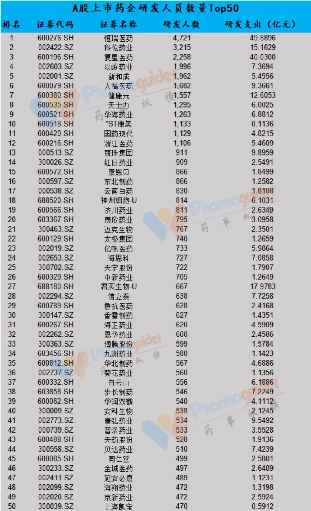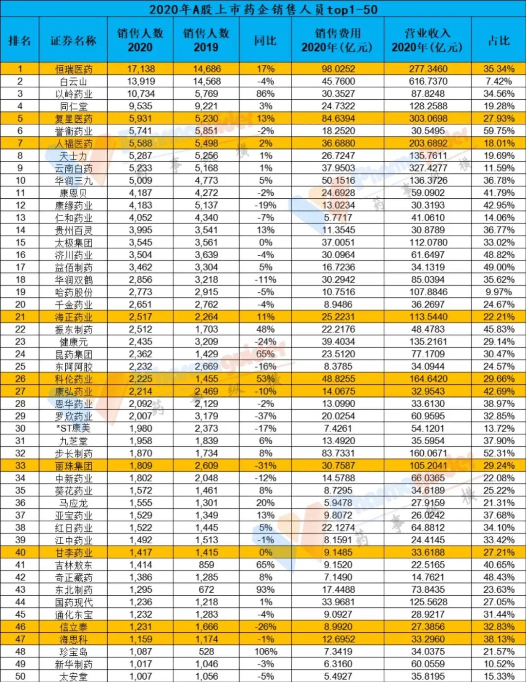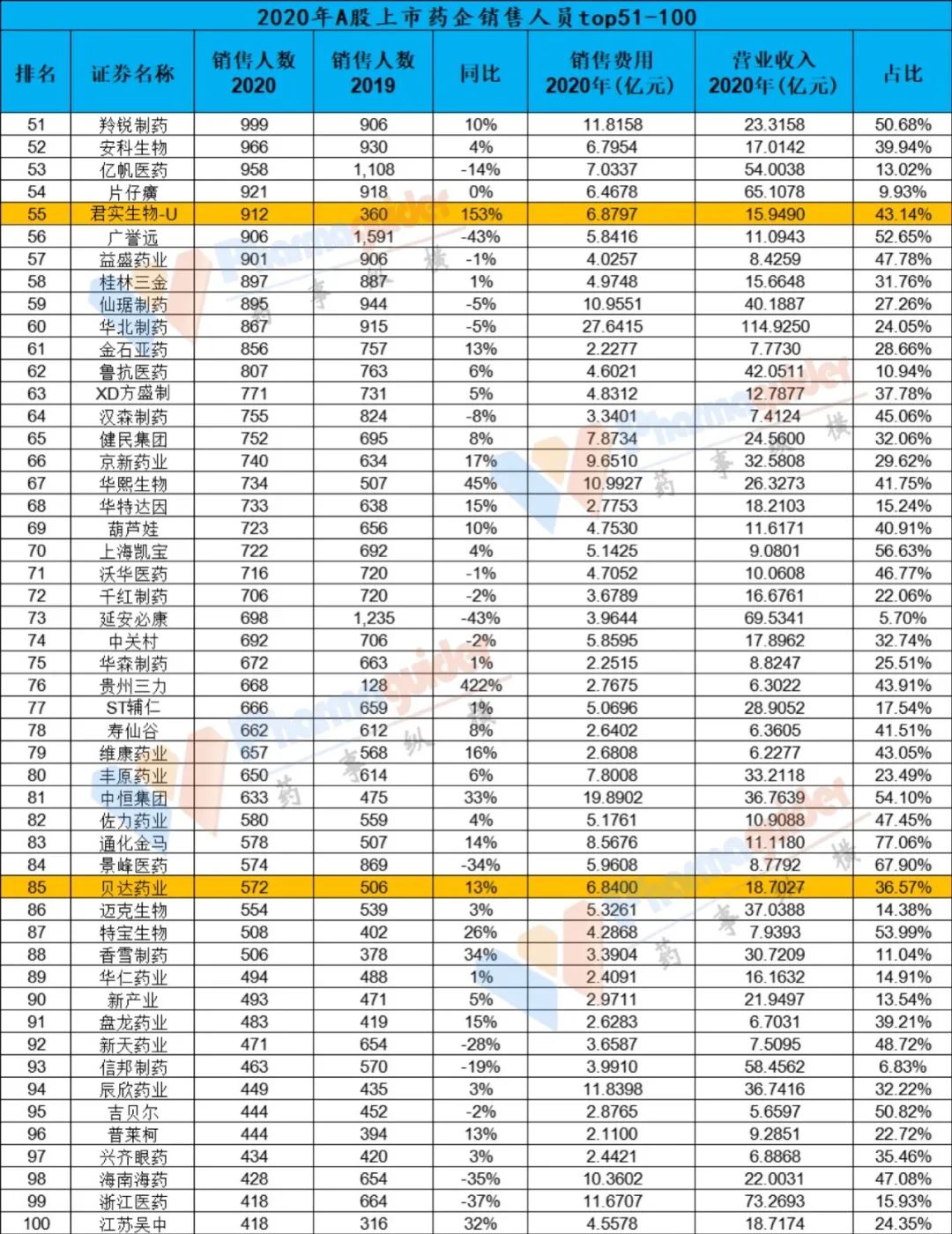 我们按照GICS行业分类,选取A股上市制药公司(港股未披露数据),按照销售人员数量进行排序Top100,先总后分。