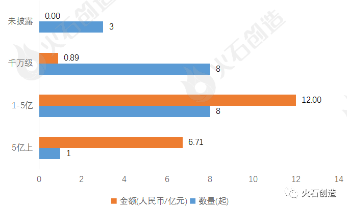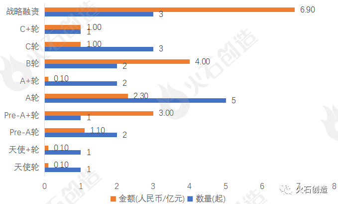 从融资轮次上看,本月融资事件大多集中A轮,共有5个项目获投。从融资金额来看,战略融资轮次获得最高融资金额6.90亿元,占总体融资金额的35.19%;其次,B轮也获得了较高的融资金额4.00亿元,占总体融资金额的20.41%。