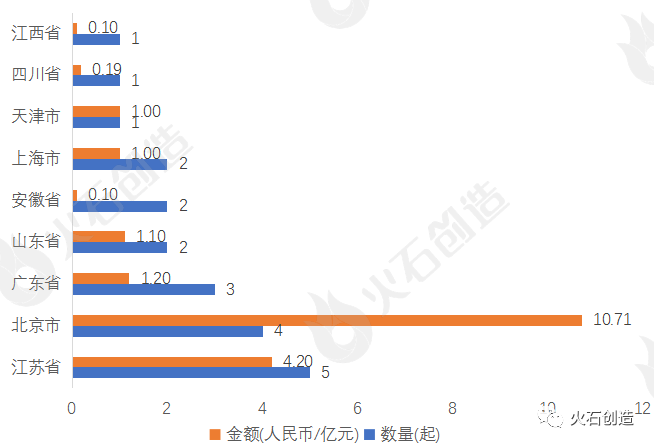 本月融资项目主要分布在江苏省(5起)和北京市(4起)。从融资金额来看,北京市最为突出,融资金额高达10.71亿元,占总融资金额的54.66%;其次,江苏省也较为突出,融资金额高达4.20亿元,占总融资金额的21.43%。