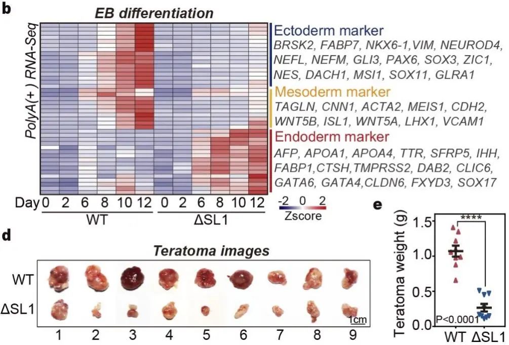 由于DGCR8的ATI介导的miRNA剂量控制在EB分化4天后开始出现,作者推测该机制可能影响了后期发育阶段的细胞命运决定。分析发现,ATI引起的DGCR8短亚型主要在内胚层细胞中检测到,而不在外/中胚层或EpiSC中 [10]。对WT和ΔSL1细胞进行的神经祖细胞(外胚层)或EB分化的转录组均显示,SL1缺失导致的miRNA剂量控制的缺失显著抑制了干细胞向外胚层和中胚层的分化。通过小鼠畸胎瘤实验,作者观察到来自ΔSL1细胞的畸胎瘤与来自WT细胞的畸胎瘤相比,其大小和重量显著减少,这意味着miRNA剂量控制的缺失导致了发育缺陷。对畸胎瘤切片进行形态学和免疫荧光分析也表明,与WT细胞相比,ΔSL1细胞生成的内胚层组织相对较多。此外,使用脂质代谢小分子抑制剂 (GW9662) 处理分化的EB细胞,发现抑制脂质代谢会抑制胚胎干细胞向内胚层的命运转变,但促进向中胚层的发育。总的来说,以上数据表明ATI介导的miRNA剂量控制机制可以通过调节脂质代谢来影响胚层分化(图4)。