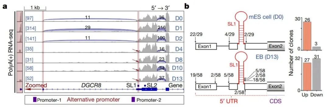通过分析RNA-seq数据,作者意外地发现了一个没有第一个外显子的DGCR8 mRNA的短亚型,该亚型在小鼠胚胎干细胞 (mouse embryonic stem cell, mESC)向拟胚体(embryoid body, EB)分化的第4天首次出现,与两个预测的可变启动子位置相符。5’ RACE (5’ Rapid Amplification of cDNA End) 实验也证明mESC中DGCR8 mRNA的5’ 末端主要是已注释的类型,然而在EB细胞中(第13天)约有一半的5’ 末端是跳过第一个茎环结构 (SL1) 的短亚型(图1)。由此得知DGCR8在mESC分化过程中存在选择性转录起始(alternative transcription initiation, ATI)。