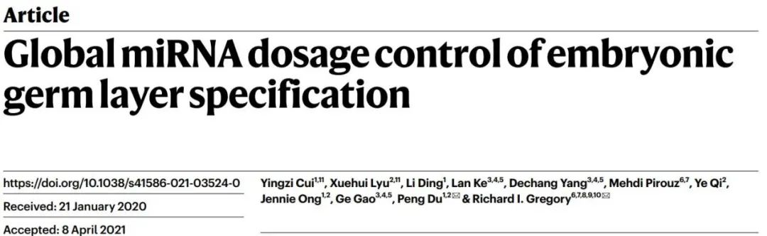 2021年5月5日,北京大学杜鹏课题组与哈佛大学Richard I. Gregory合作在Nature杂志在线发表了题为“Global miRNA dosage control of embryonic germ layer specification”的研究论文。该研究发现,通过转换DGCR8不同的启动子,可以使Microprocessor在可溶状态和聚集状态中保持平衡,从而精确地控制全局的miRNA剂量,并在早期胚胎发育中影响胚层的分化过程。
