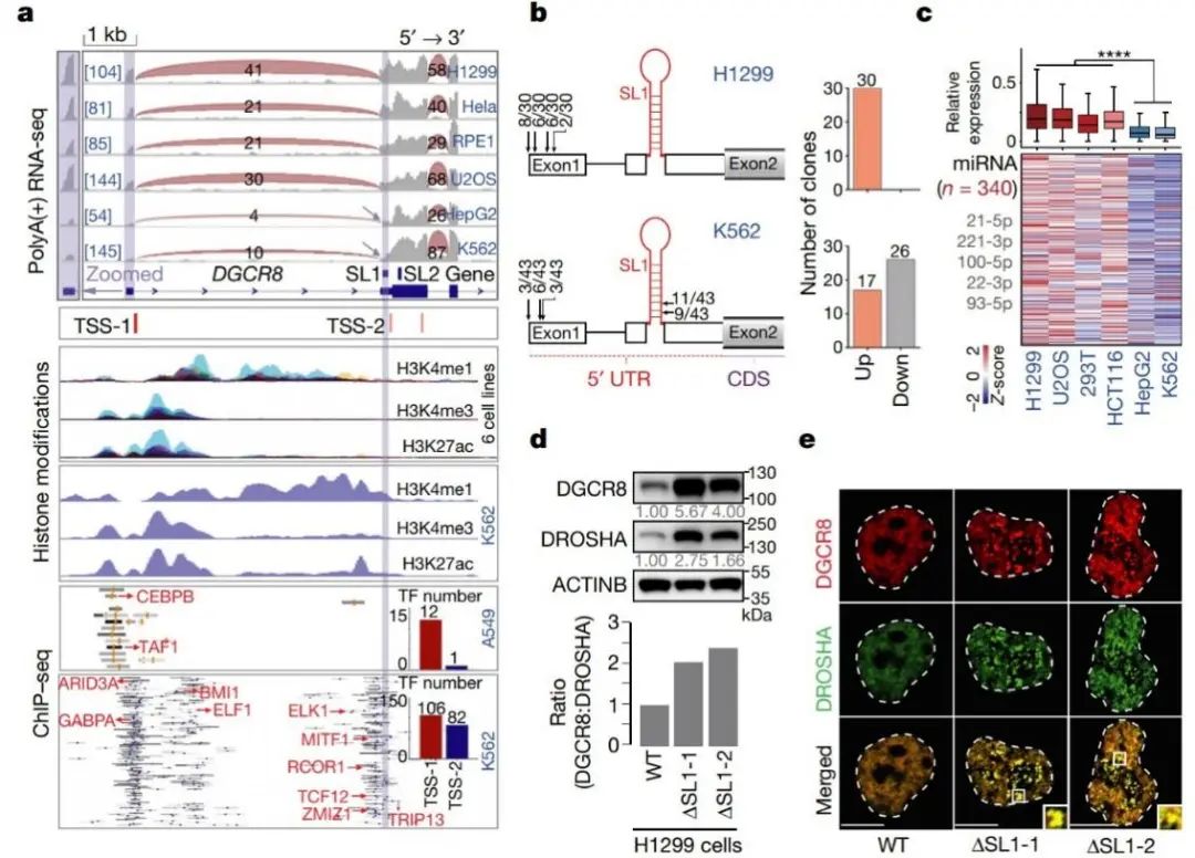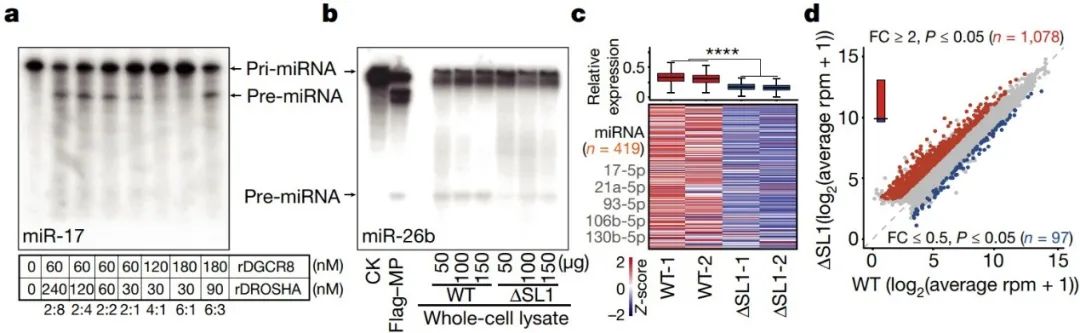 作者推测由ATI引起的SL1跳跃性可能会影响Microprocessor的自我调节机制。为了验证这一点,他们构建了ΔSL1细胞系。与WT细胞相比,ΔSL1细胞中DGCR8和DROSHA蛋白均有显著积累。然而DGCR8蛋白的积累量是DROSHA蛋白的3倍,导致DGCR8蛋白过量,蛋白比例失调。结合其他实验结果可以得知,位于5’ UTR的SL1负责Microprocessor的自我调节,以保持精确的DGCR8:DROSHA化学计量。