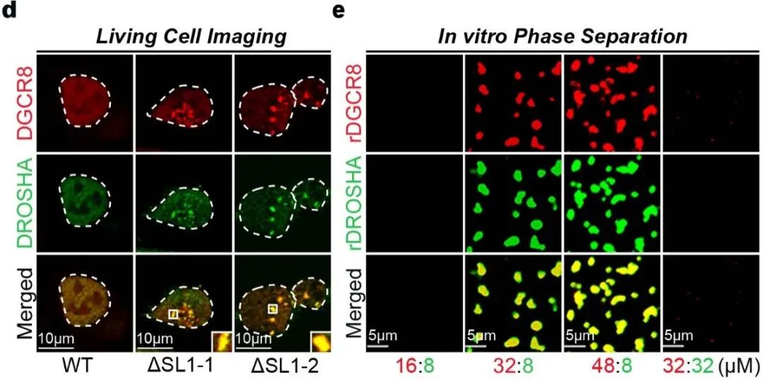 由于大分子的相分离影响各种生化反应【7,8】 ,并且化学计量对生物分子凝聚物的形成很重要【9】,作者接下来探讨了Microprocessor可能存在的相分离现象。作者发现, Microprocessor在ΔSL1细胞中形成了许多明显分离的不可逆的puncta, 但WT细胞中没有。接下来作者进一步在体外验证了Microprocessor的相分离现象。由于结构研究表明一个Microprocessor由两个DGCR8和一个DROSHA蛋白构成,作者将rDRCG8和rDROSHA先以2:1的比例混合,没有检测到明显的相分离。而在DGCR8:DROSHA比值为4:1和6:1的混合物中,出现了许多明显的Microprocessor不可逆的聚集。综上所述,受调控的DGCR8:DROSHA化学计量比对于维持Microprocessor的可溶性是重要的,但转录后自我调节机制的破坏导致DGCR8:DROSHA化学计量失衡,直接导致Microprocessor形成缺乏流动性的不可逆聚集(图2)。