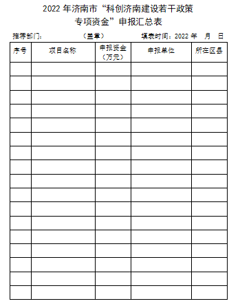 (三)市市场监管局对申报单位材料和区县推荐情况进行审核确认报济南市科技局,并填报《2022年济南市“科创济南建设若干政策专项资金”申报汇总表》(附件2),加盖单位公章后与其他申报材料(纸质版和PDF版)于6月30日(周四)前汇总提交至市科技局。