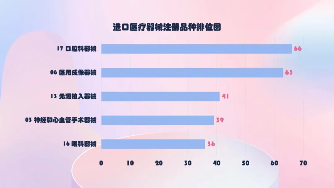 口腔科器械、医用成像器械、无源植入器械、神经和心血管手术器械、眼科器械。其中,口腔科器械从2019年的57项,增加到2020年的66项,增加约15.8%。