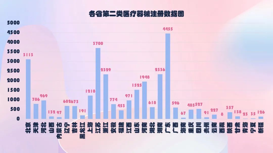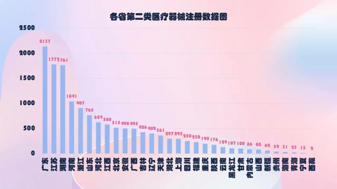 从注册情况看,广东、江苏、北京、湖南、浙江、河南、山东、上海、江西、河北10省(直辖市)注册的境内第二类医疗器械数量较多。