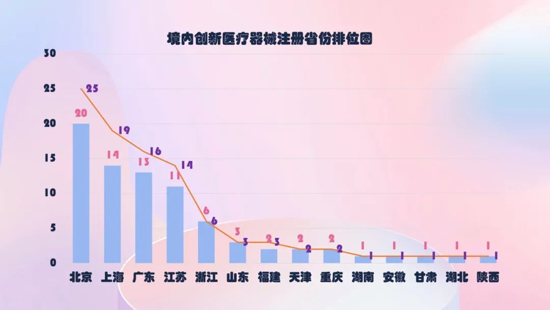 北京、上海、广东、江苏、浙江创新医疗器械获批产品数量和相应企业数量最多,约占全部已批准的99个创新医疗器械的81%。