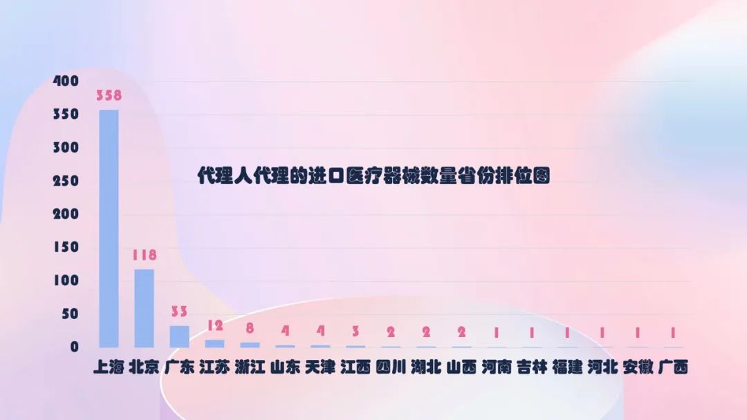 从进口医疗器械代理人分布看,共有17个省涉及有本省企业作为进口医疗器械代理人,其中上海市代理人代理的进口首次医疗器械数量最多,占全部进口医疗器械数量的64.9%。