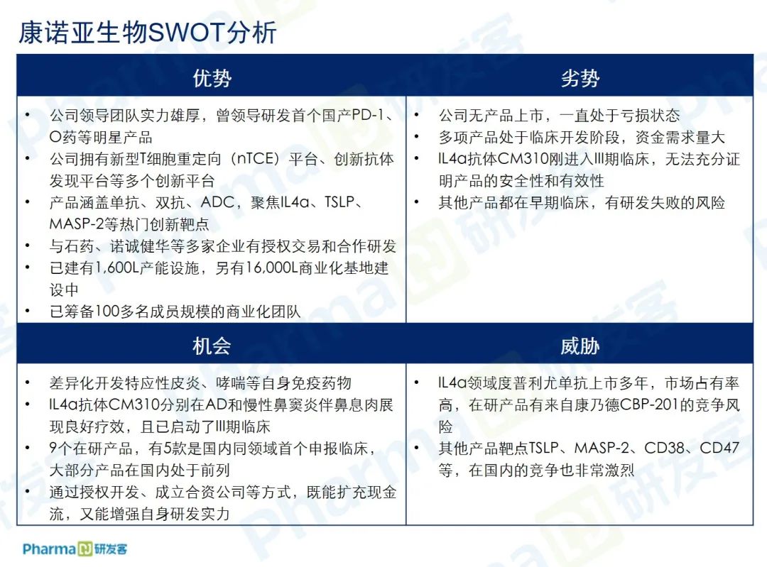 康诺亚SWOT分析:数个靶点领域研发领先,核心产品IL4α抗体进III期 | 研究院