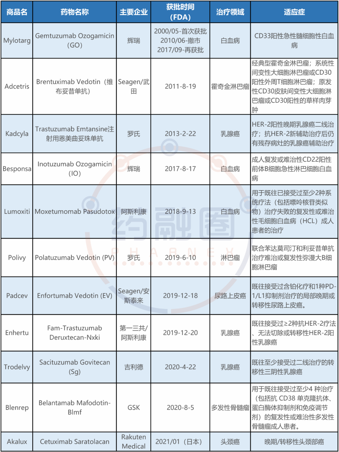 目前,全球共有11个ADC药物获批,分别是武田/Seagen的Adcetris、罗氏Kadcyla、辉瑞/惠氏的Besponsa、辉瑞/惠氏Mylotarg、阿斯利康的Lumoxiti、罗氏的Polivy、第一三共/阿斯利康的Enhertu、Immunomedics的Trodelvy、GSK的Blenrep和RakutenMedical的Akalux。