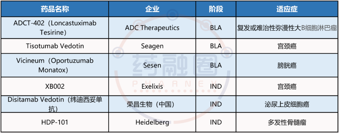目前,全球共有6个ADC药物新药申请上市,包括3个小分子化药和3个生物药,涉及宫颈癌、膀胱癌、尿路上皮癌等肿瘤领域,如DisitamabVedotin(荣昌生物)、ADCT-402(ADCTherapeutics)、DisitamabVedotin(Seagen)等。