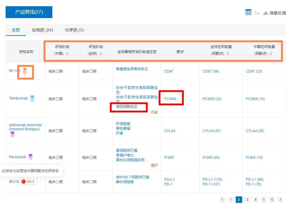在产品管线维度,您可透视管线研发进度、靶点、同靶点在研药物数量,同时药渡生态为您标注该管线在中国同靶点的在研排名,让您对产品排名及赛道拥挤度了然于胸。