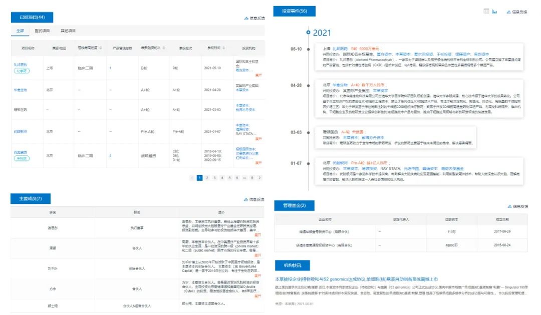 医药企业详情页涵盖已投项目、投资时间、主要成员、管理基金、机构快讯等维度,帮助您全面分析投资机构的行业偏好、投资阶段、投资风格、资金情况,为创业企业提供更精准、更高效的融资对接服务。