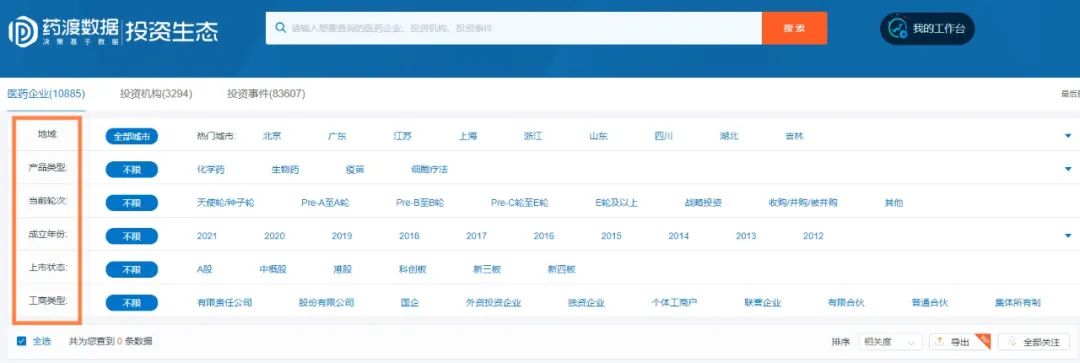 医药企业检索模块涵盖了不同地域、产品类型、轮次、成立时间、上市状态和工商类型等多维度检索条件,您可高效精准地从海量信息中筛选目标客户。