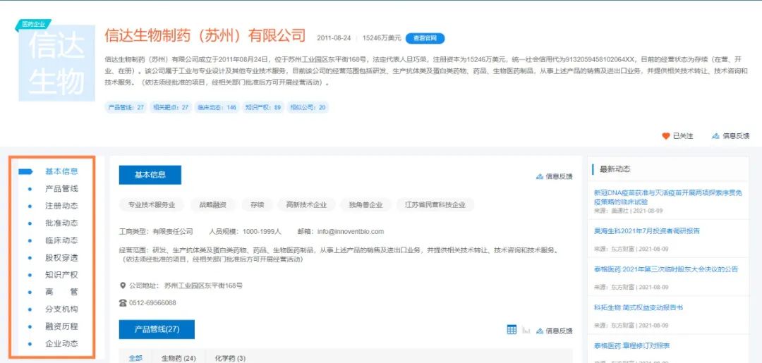 医药企业详情页涵盖企业基本信息、产品管线、注册批准动态、临床动态、股权穿透、知识产权、高管、分支机构、融资历程、企业动态和同靶点相关公司等超多维度,让您对各企业信息了如指掌,为您的投资决策上一把安全锁。