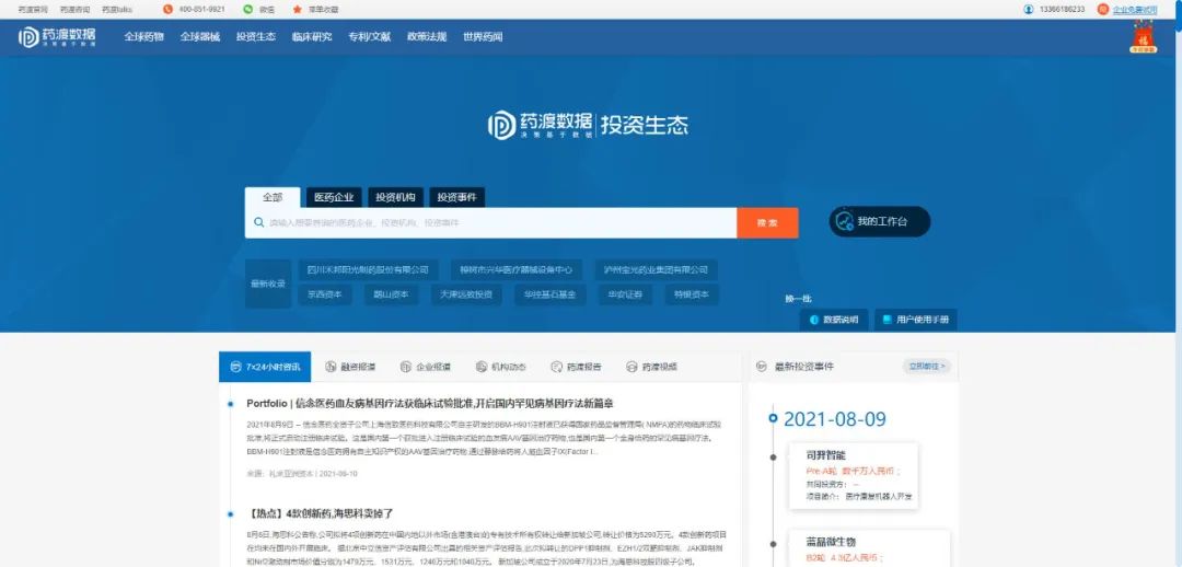 在药渡投资生态版块首页,您可一键检索您关注的医药企业、投资机构或交易事件,可纵览7×24小时全球医药行业咨询及跟踪最新投资事件。