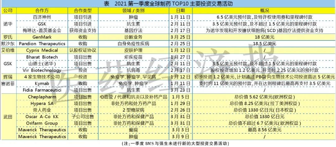 此外,2020年,百时美施贵宝(BMS)以131亿美元收购心脏药物公司MyoKardia,强生以65亿美元收购美国制药公司Momenta。这两笔交易分别位居2020年全球生物医药并购排行榜第3、4位,但在大型并购之后,BMS与强生今年一季度并没有进行新的大型投资交易活动。